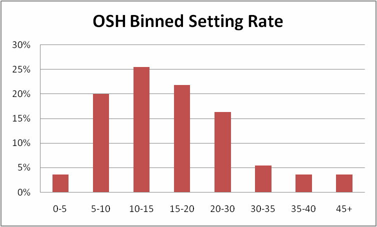 Above is a chart displaying the setting rate for 55 sets completed using OSH larvae in 2010. Total resulting spat-on-shell planted was in excess of 150 million. Data was collected by a third party. 425 Callis Wharf Road